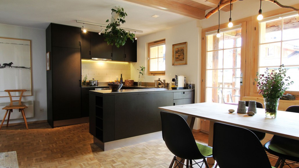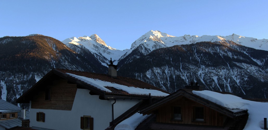 Ausblick von der Lounge. Tinzenhorn und Piz Mitgel in der Abendsonne.