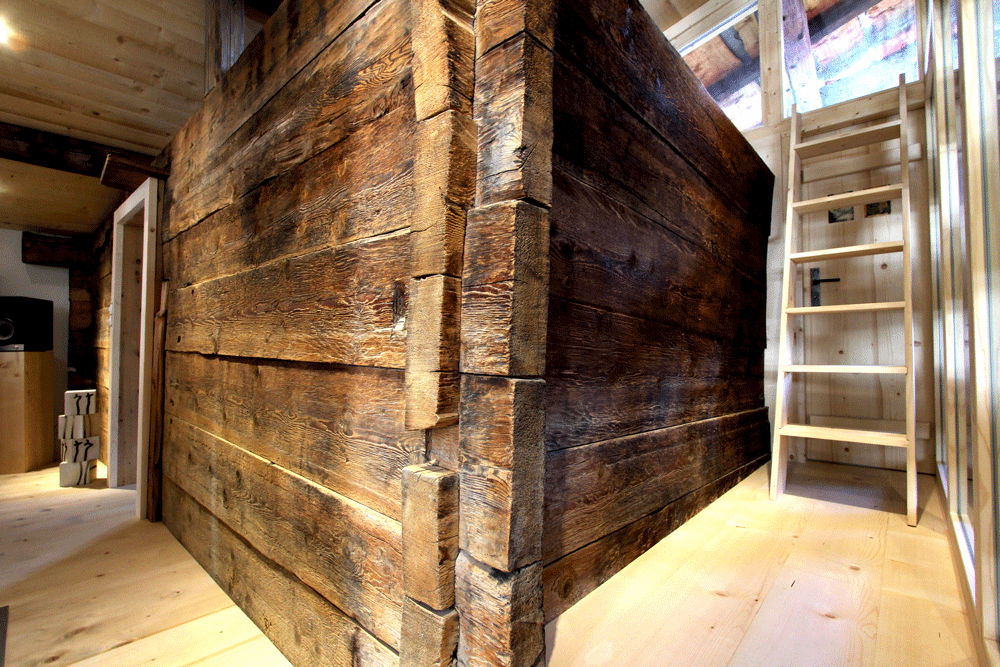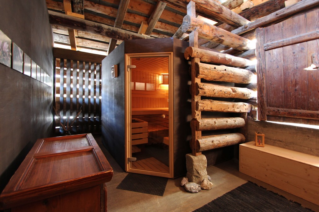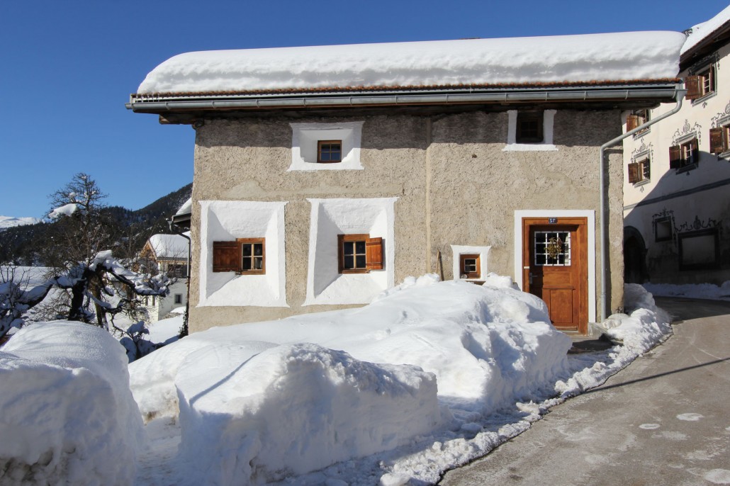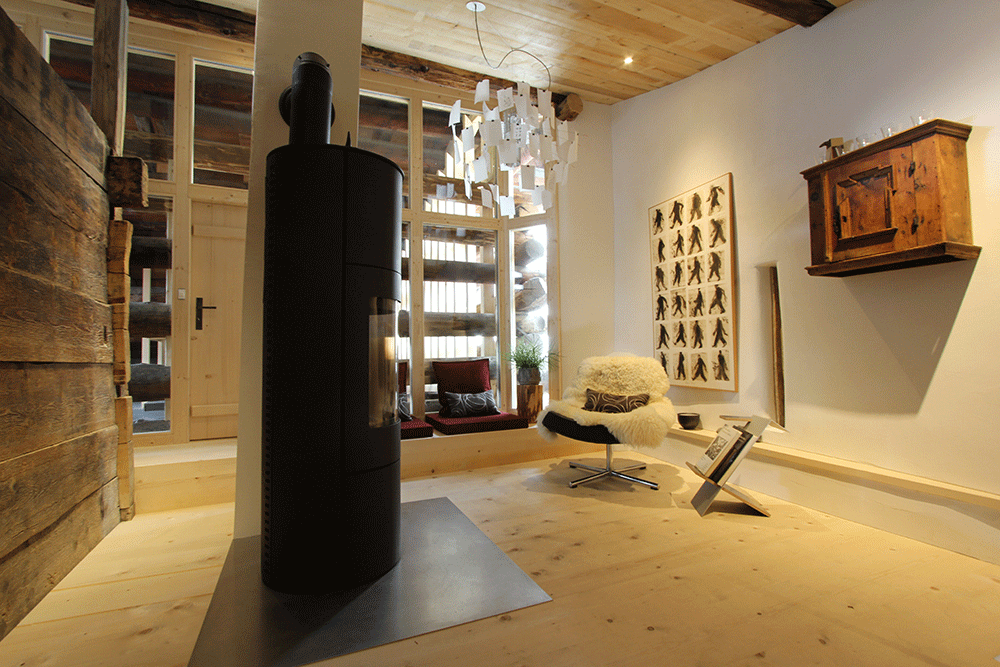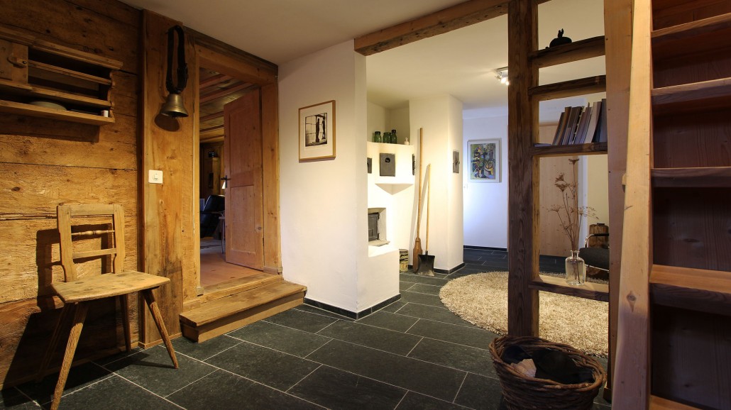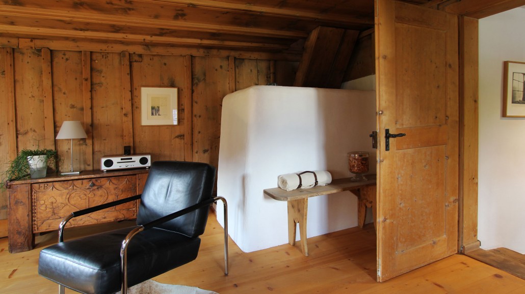 restaurierter Steinofen mit Engadiner-Tritt ins darüberliegende Schlafzimmer