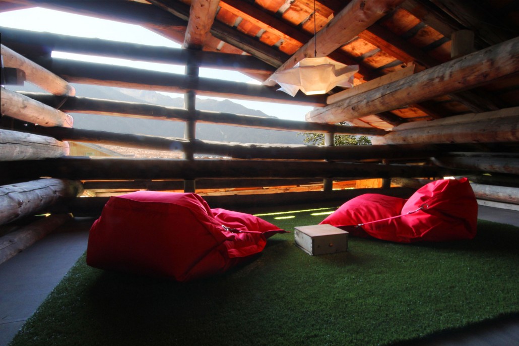 Bequeme Aussicht in die Berge: Lounge mit Fatboys