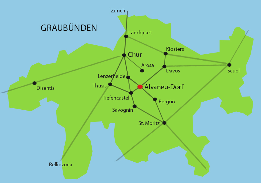 Alvaneu-Dorf auf der Sonnenterrasse im Albulatal. Im Tal unten das Thermalbad und der 18-Loch Golfplatz.